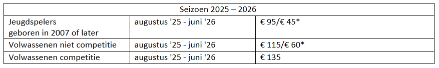* Nieuwe leden die na Nieuwjaar aansluiten, betalen € 60,- (voor volwassenen niet competitie) of € 45,- (voor jeugdspelers).